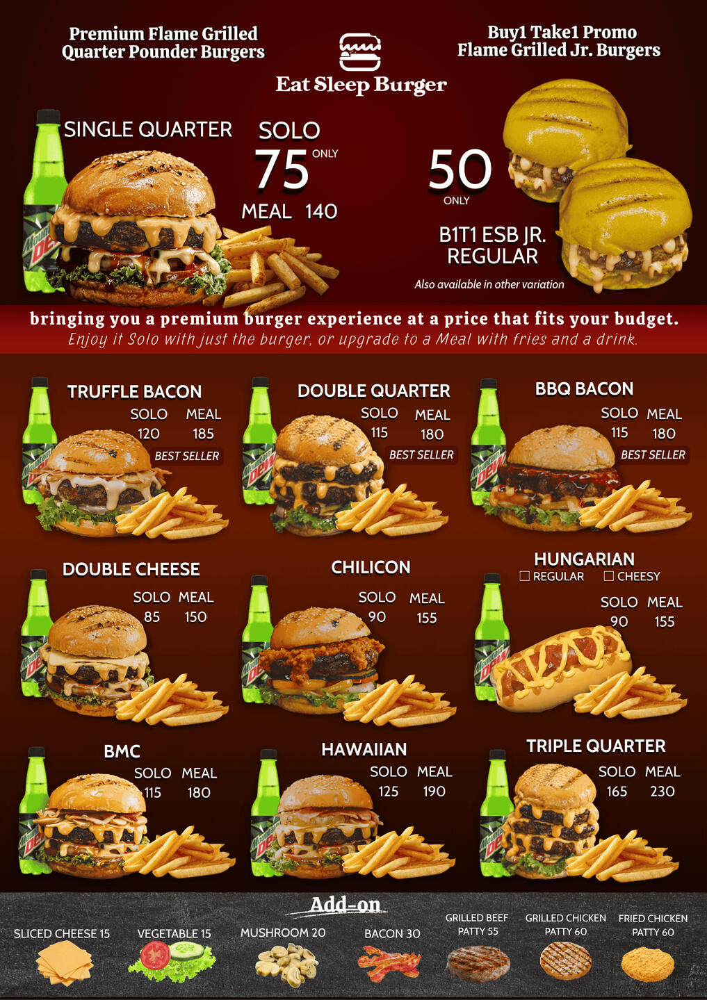 At Eat Sleep Burger, we’re proud to serve burgers that are flame-grilled, packed with flavor, and made with love — no shortcuts, just real, delicious food you’ll keep coming back to.